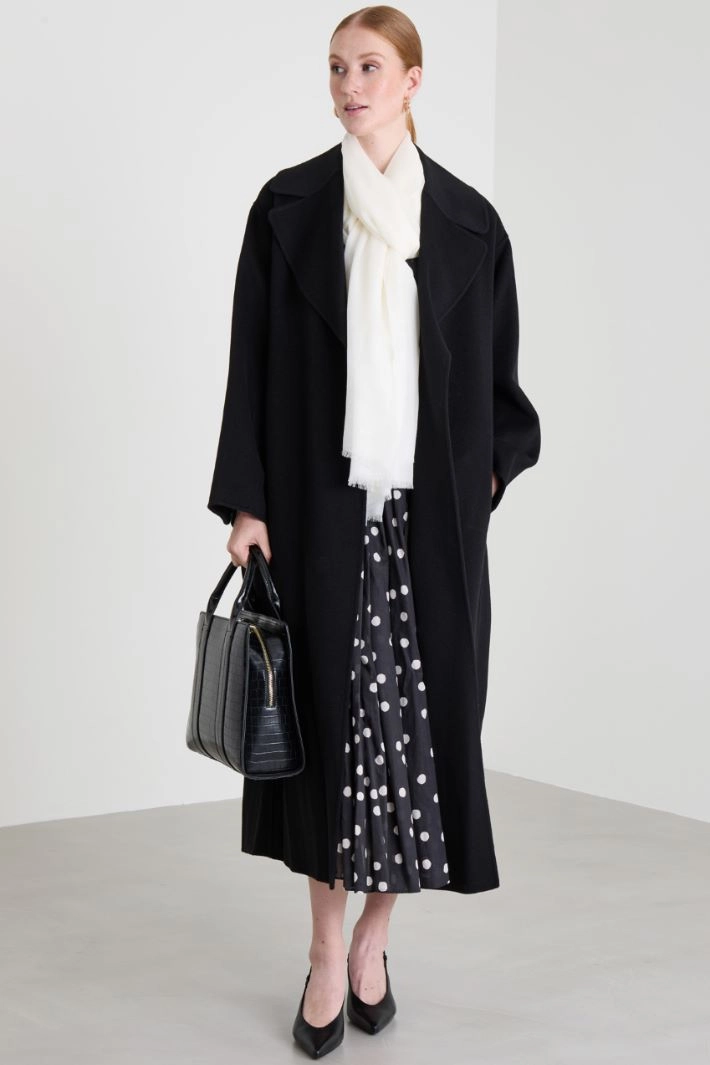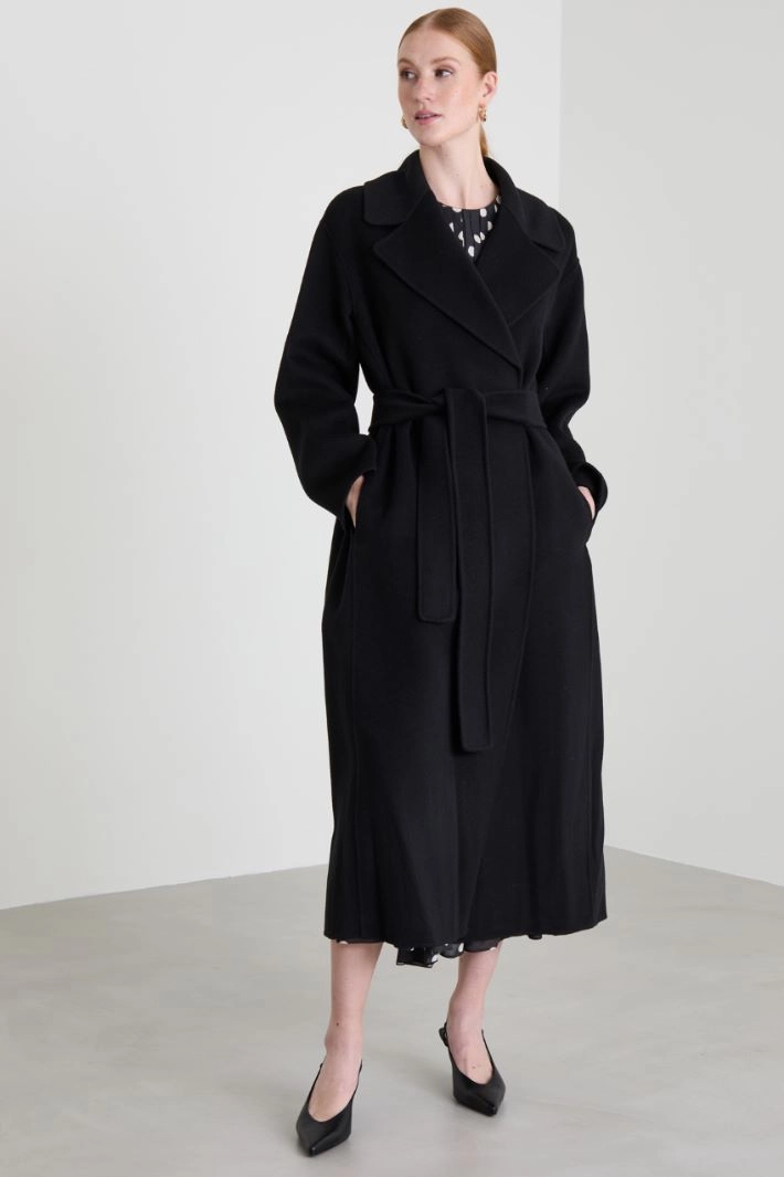 Straight-fit coat in double wool blend fabric, with lapel collar, long sleeves and inset pockets. Matching belt.