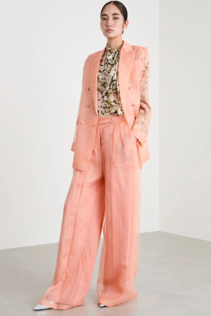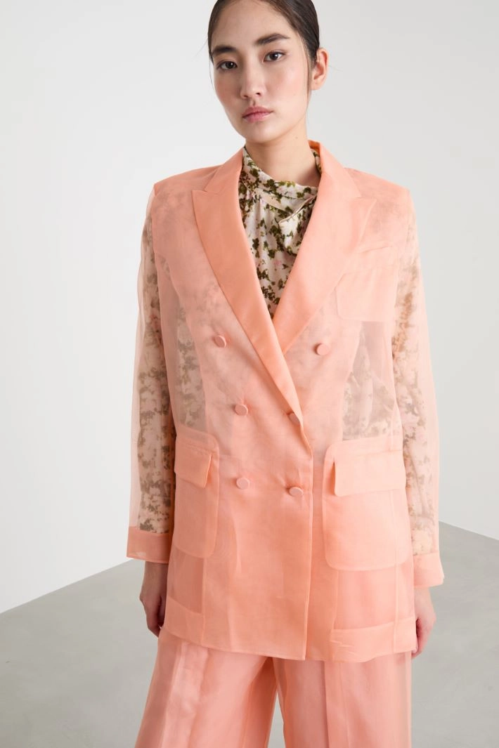Straight-fit double-breasted blazer in pure silk organza, featuring peak lapels, long sleeves, a chest pocket, welt pockets with flaps on the front and a double vent at the back. Fastening with covered buttons.
