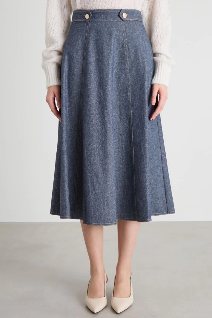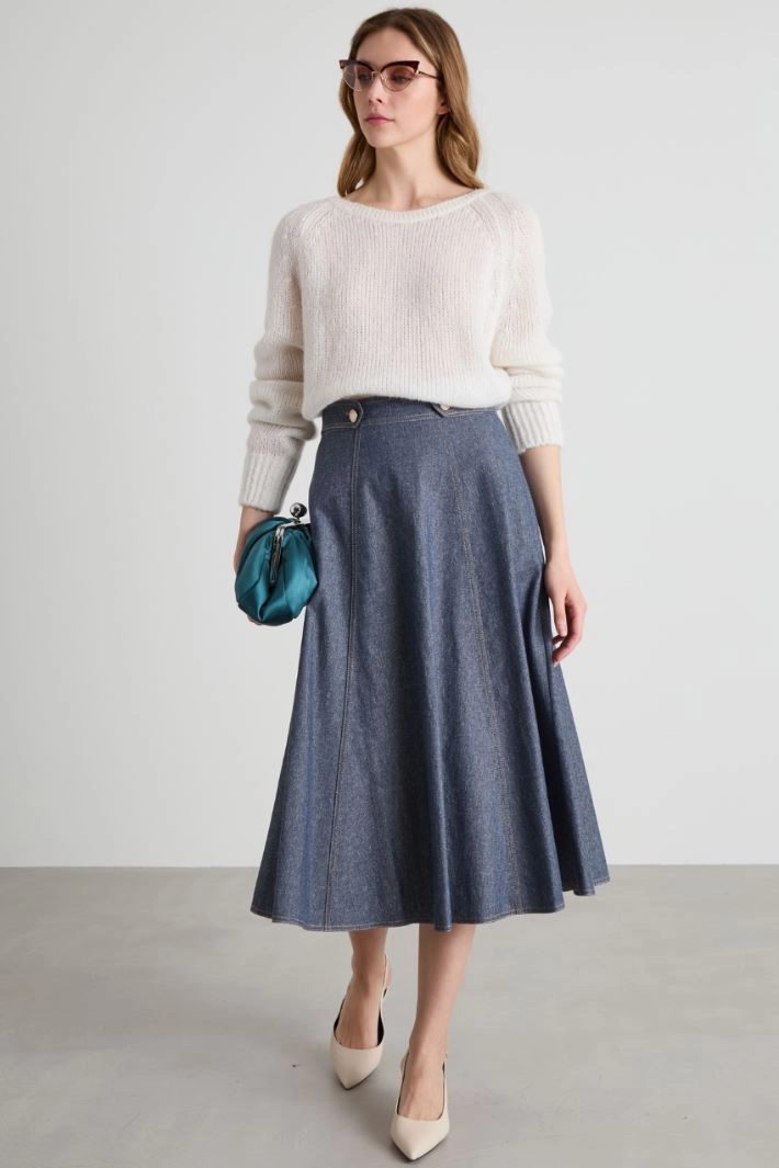 Flared skirt in stretch cotton blend denim effect fabric, with lamé fiber insert and toggles with jewel button at the waist. Concealed zip fastening at the center back.