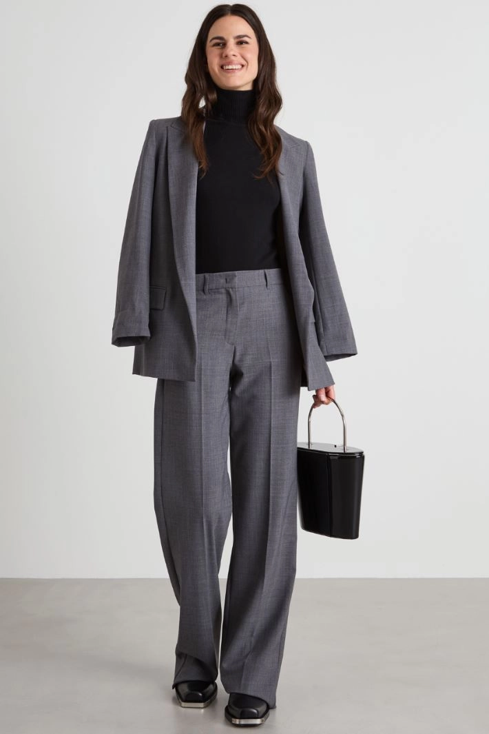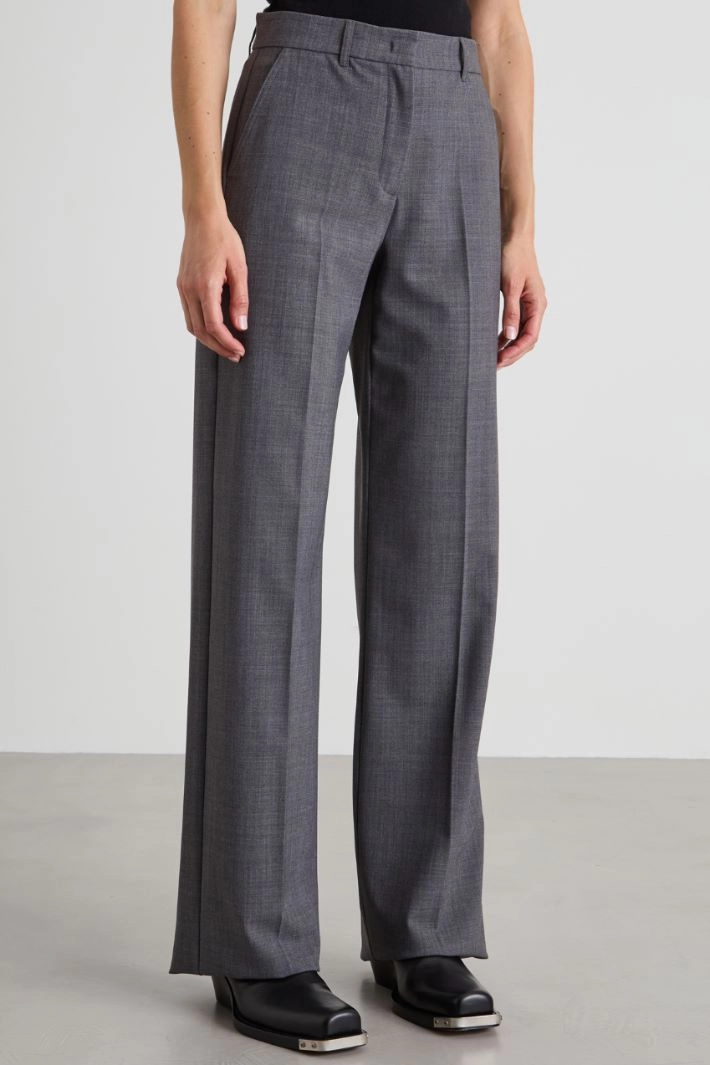 Straight-cut trousers in wool blend canvas, with belt loops at the waist, French pockets in the front, welt pockets at the back and crease ironed along the length. Hidden fastening with zip, button and hook.