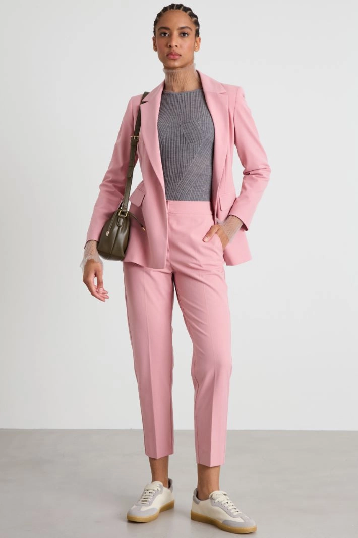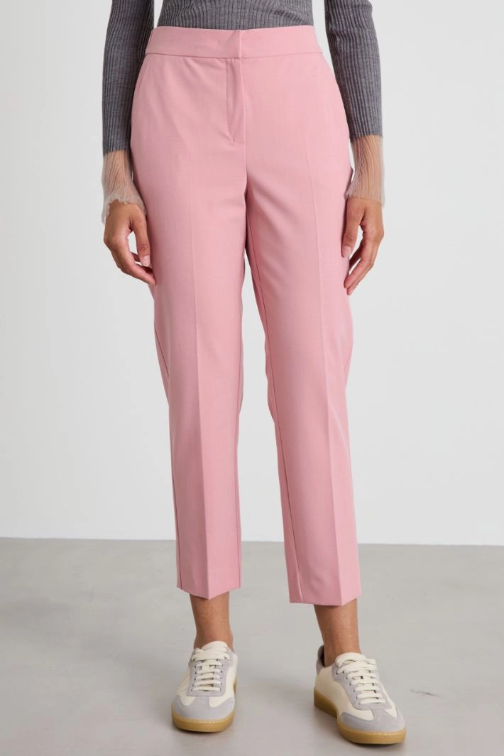 Cigarette trousers in viscose blend batavia, with pressed crease along the length, elasticated insert at the waist at the back and French pockets at the front. Hidden fastening with zip, button and hook.