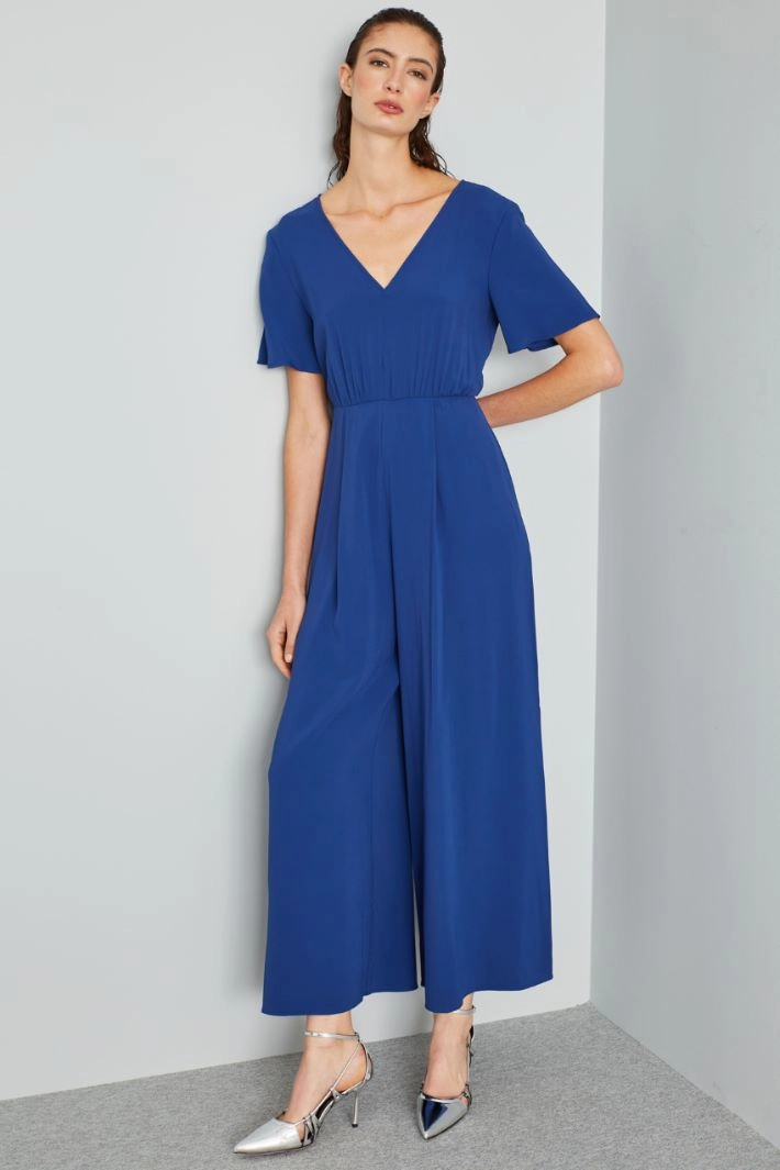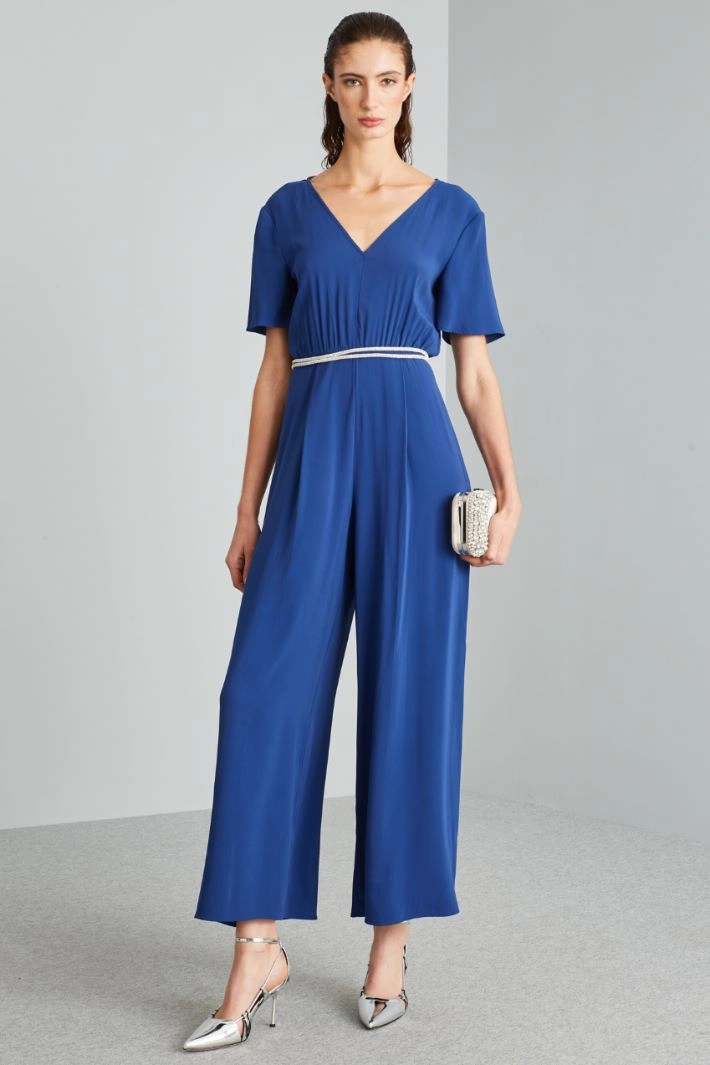 Slim-fit jumpsuit in stretch viscose blend enver satin, with a V-neckline at the front, short sleeves, gathered waist and sewn pleats, and a teardrop opening with a button at the back. Invisible zip fastening at the back.