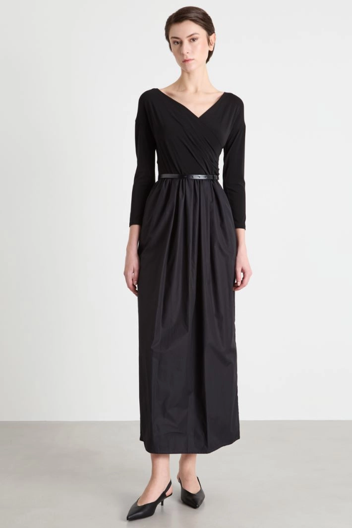 A semi-fitted long dress. The stretch viscose jersey top features a crossover V-neck, three-quarter sleeves and side ruching, while the pure cotton poplin skirt is detailed with in-seam pockets and a central rear vent. Finished with a concealed zip fastening at the back and a matching belt.