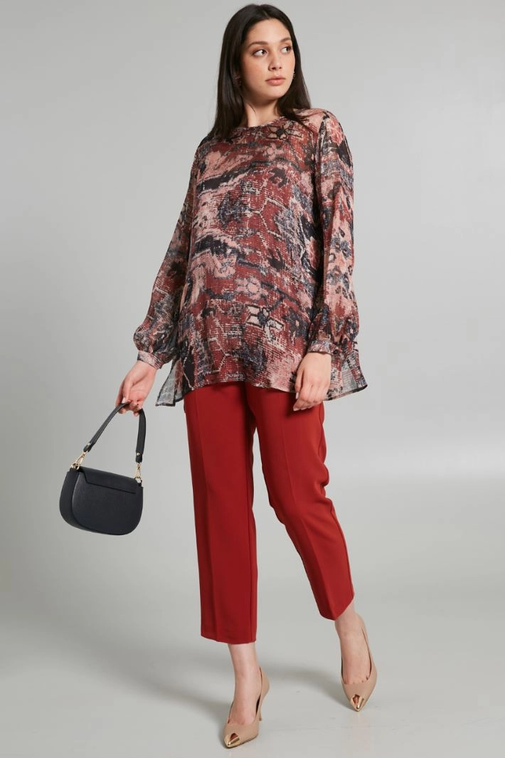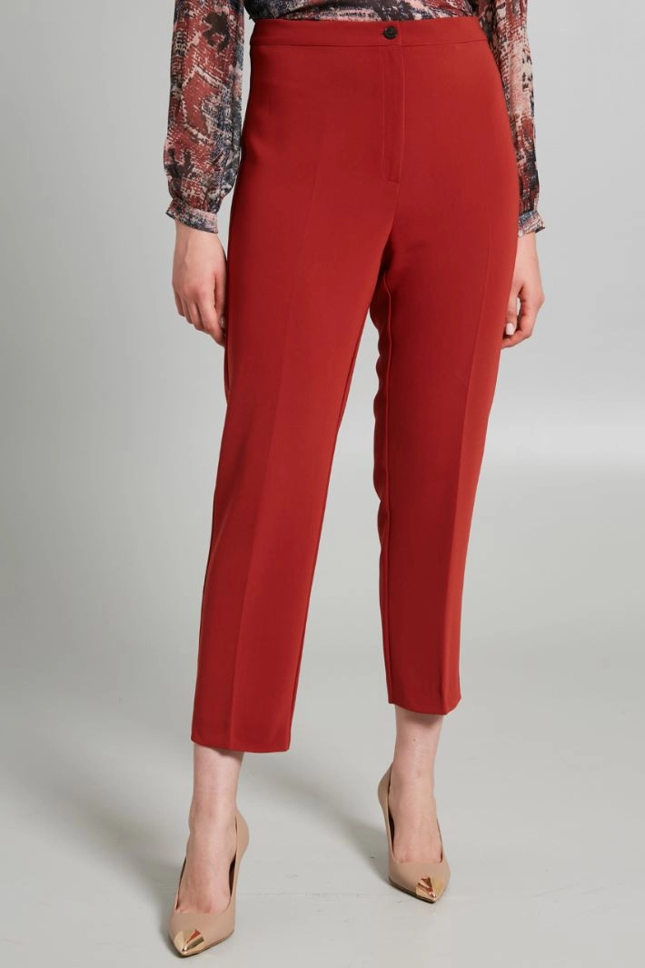 Straight-cut trousers in crepe de chine, with elastic waistband. Fastening with button and hidden zip.