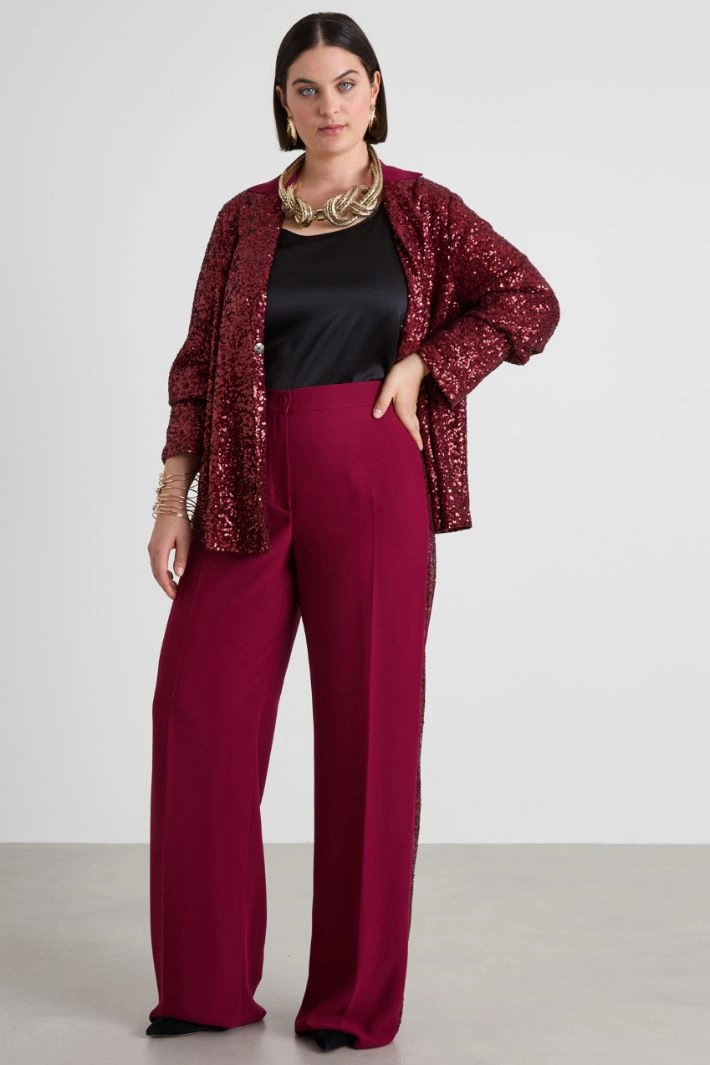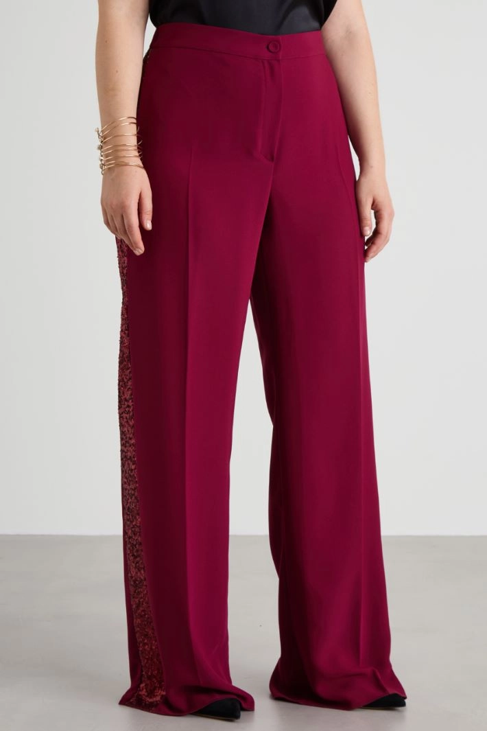 Envers satin palazzo trousers with elasticated waistband, side bands with micro sequins embroidered in the same tone, crease ironed lengthwise and fastening with hidden zip and covered button.