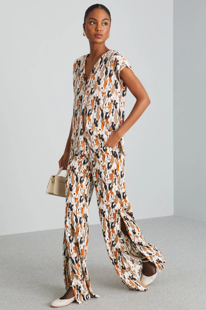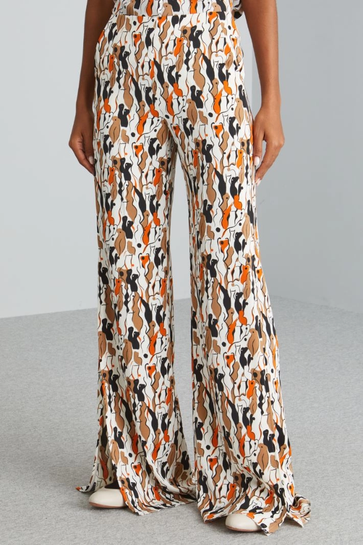 Palazzo trousers in all-over printed satin, with side French pockets and single welt pocket on the back, invisible zip fastening and hook on the back.
