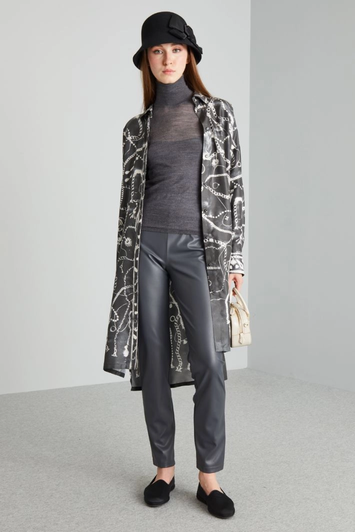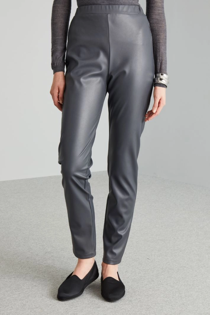 Slim trousers in leather-effect coated jersey with elastic insert at the waist.