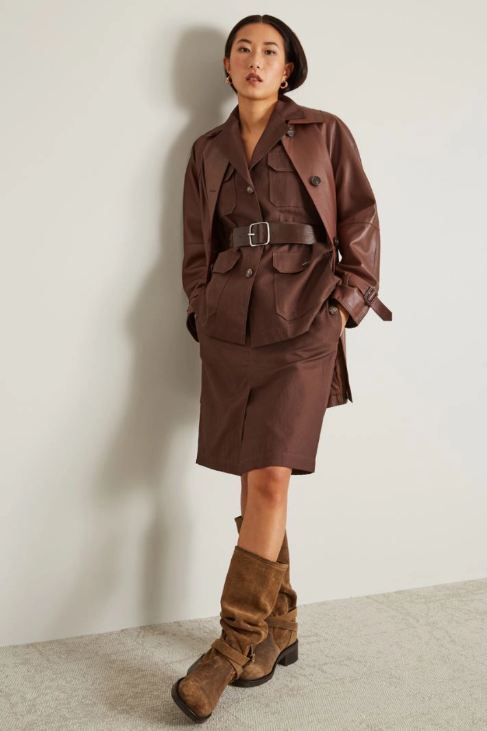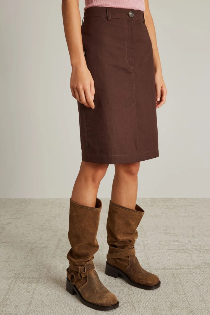 Straight-fit skirt in cotton and linen canvas, with belt loops at the waist, inset side pockets with flap and button on the back, central slit on the front and fastening with hidden zip and button.