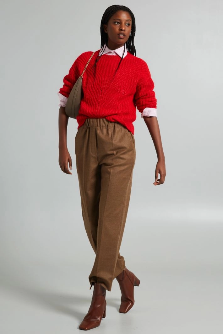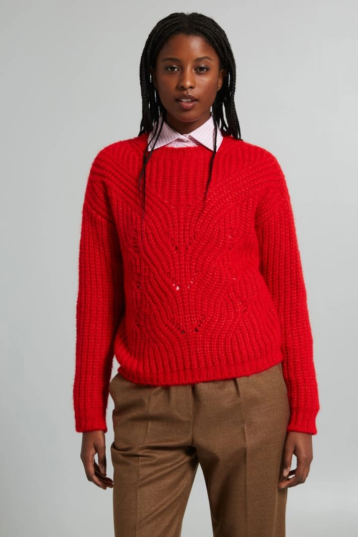 Regular-fit openwork knit sweater in ribbed wool and viscose blend yarn, with crew neck and long sleeves with dropped shoulders.