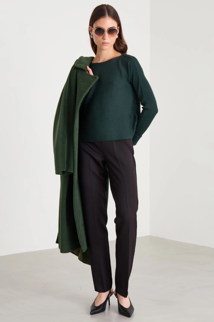 Regular-fit sweater in wool blend yarn, with horizontal ribbing, a boat neckline and long kimono sleeves with turn-ups.