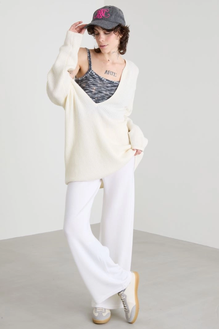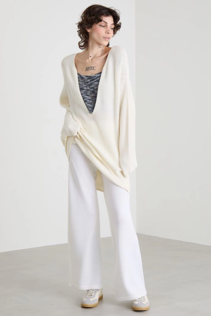 Maxi sweater with a loose fit in wool blend yarn, with ribbed knit, wide V-neckline and long dropped sleeves.
