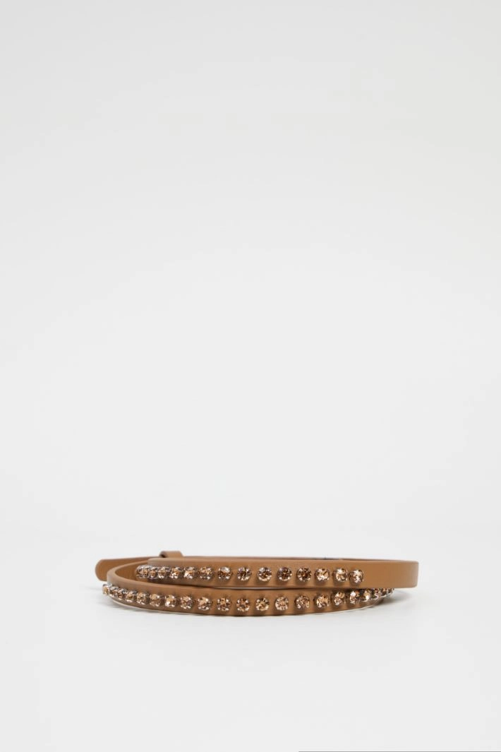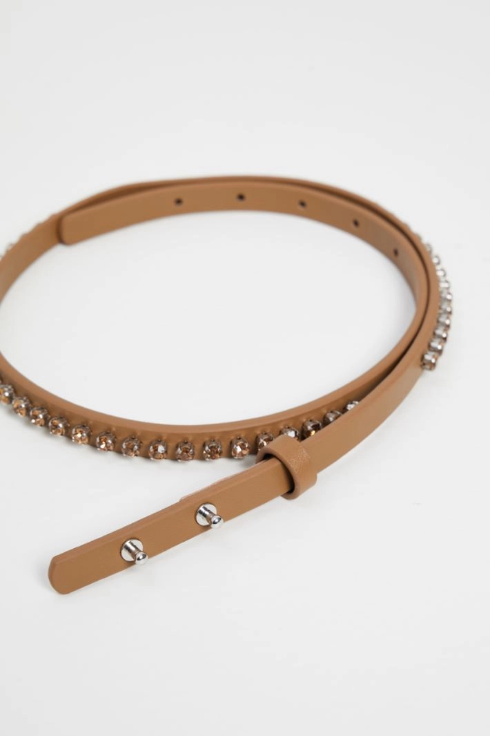 Thin belt in genuine leather, with tone-on-tone embroidered micro rhinestone detail, single loop and snap closure.