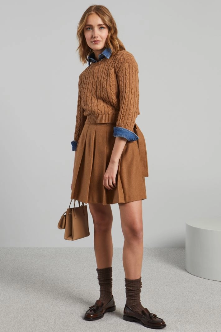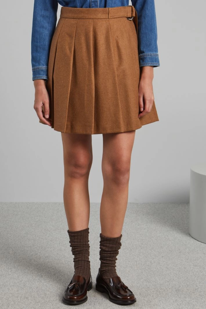 Short pleated skirt with a flared design in wool blend flannel, with belt and waist strap. Invisible zip fastening on the side. Lined.