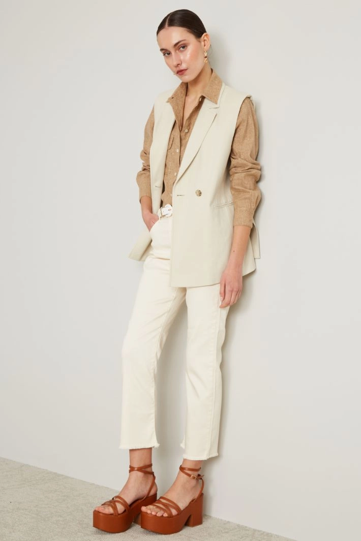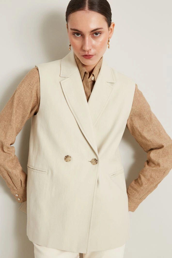 Straight-fit gilet in stretch textured cotton with lapel collar, sleeveless, double-welt side pockets, back slits and double-breasted button fastening. Lined.