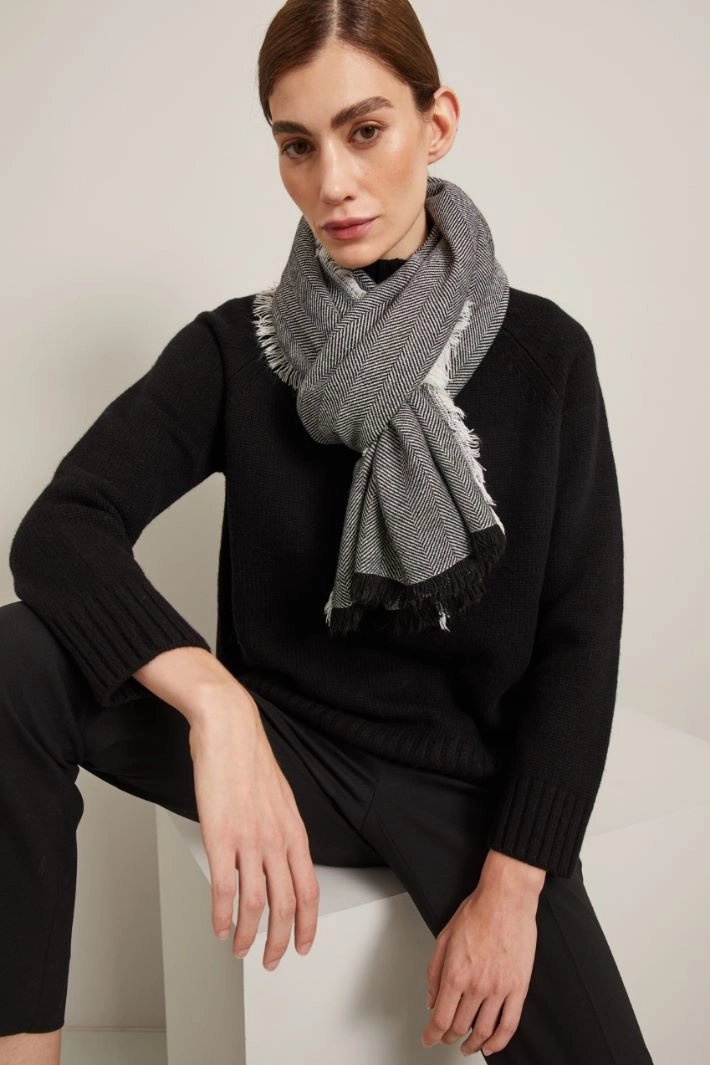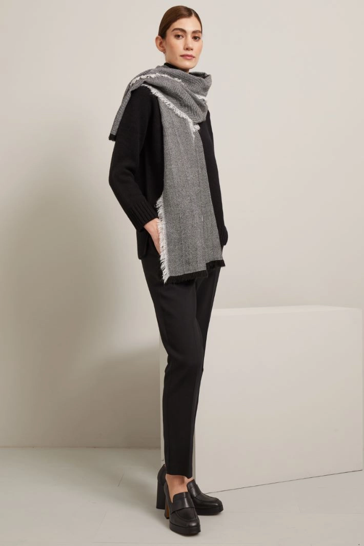 Stole in yarn-dyed viscose wool and alpaca blend yarn with fringed edges.