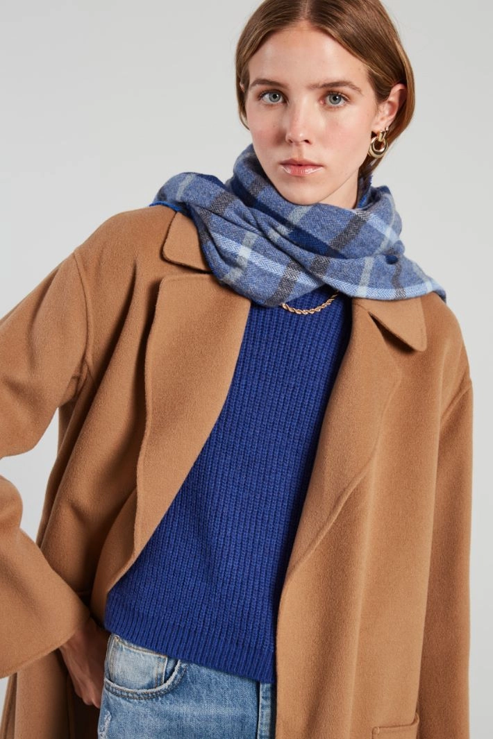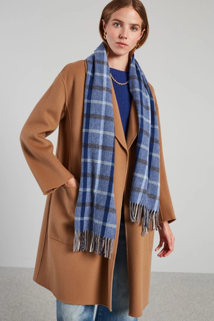Scarf in lightweight yarn-dyed wool and cotton blend cloth, with fringes at the bottom.