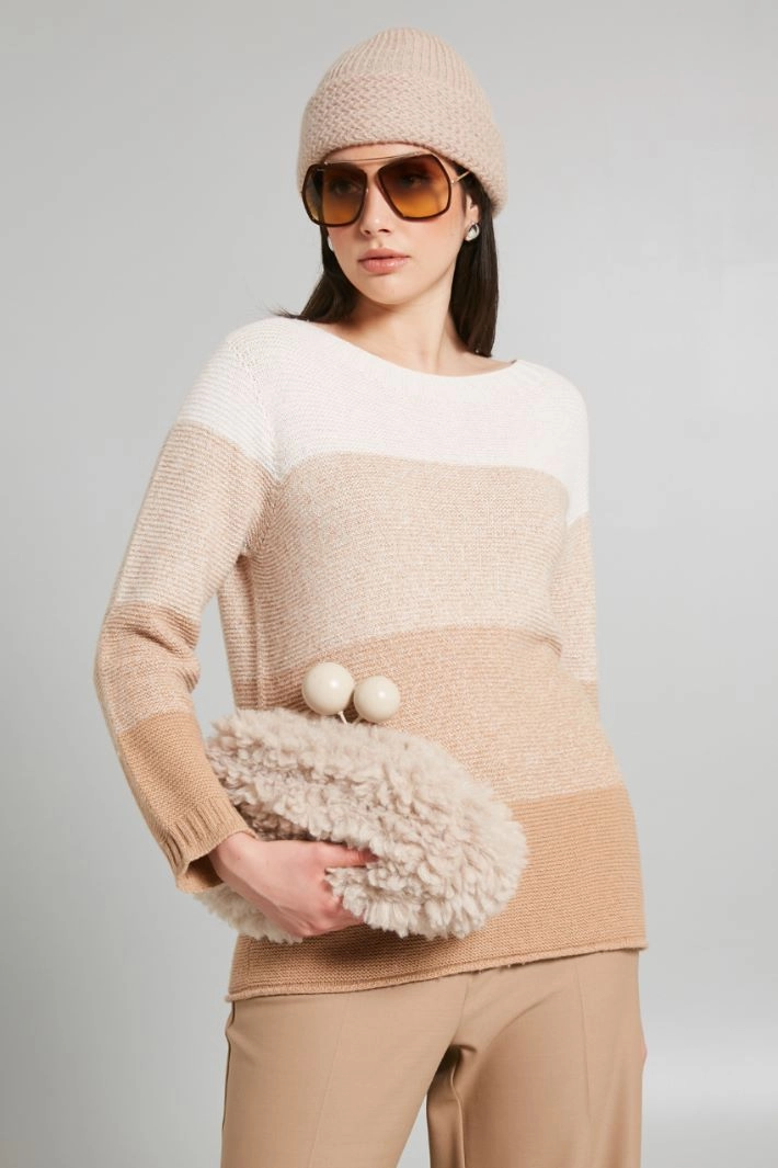 Beanie hat in mohair blend yarn with ribbing and turn-up at the bottom.