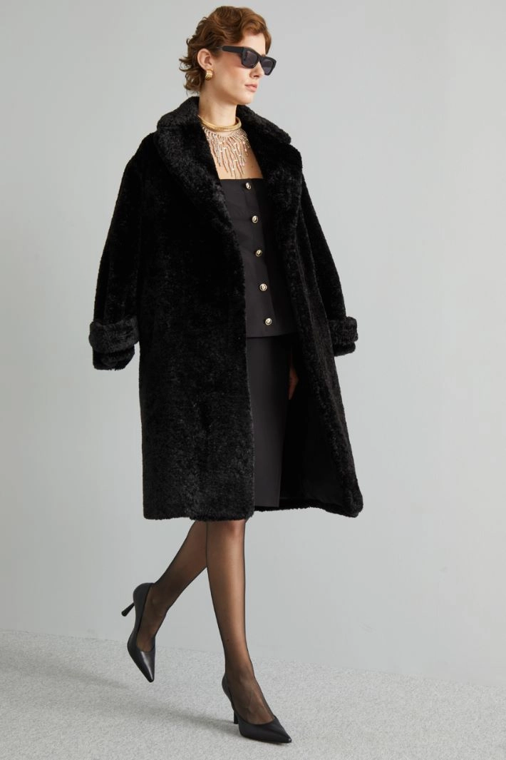 Long straight-cut coat in fur-effect jersey, with lapel collar, long sleeves with strap at the hem and welt pockets. Single-breasted fastening with press studs and coordinated belt. Lined.
