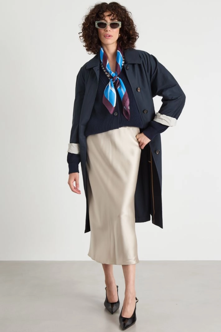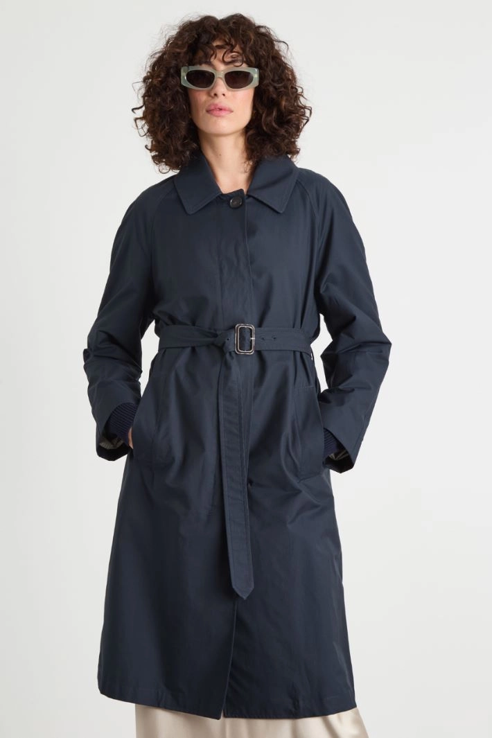 Straight-fit midi trench coat crafted in water-repellent cotton twill, with a shirt collar, long raglan sleeves, side welt pockets and a buttoned central rear vent. Fastening with a matching belt. Lined.